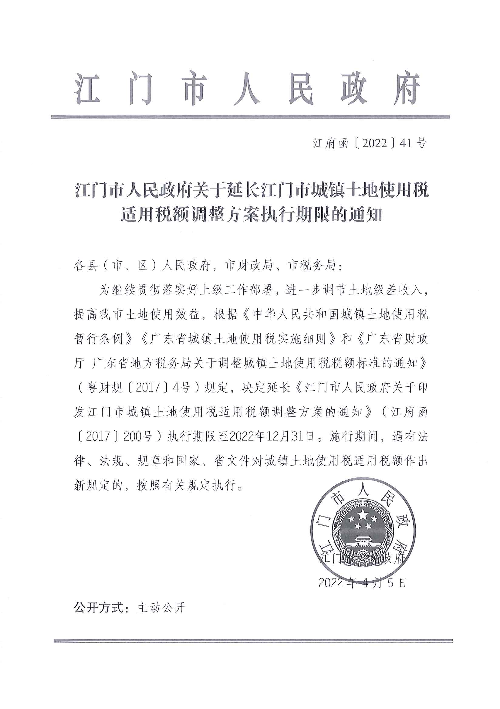 江門市人民政府關(guān)于延長江門市城鎮(zhèn)土地使用稅適用稅額調(diào)整方案執(zhí)行期限的通知