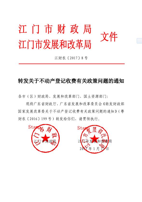 轉(zhuǎn)發(fā)關(guān)于不動(dòng)產(chǎn)登記收費(fèi)有關(guān)政策問(wèn)題的通知 江財(cái)農(nóng)[2017]8號(hào)
