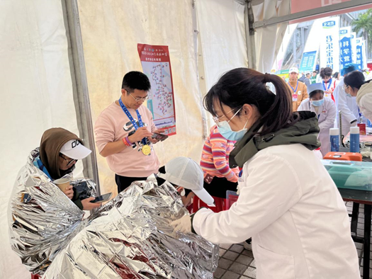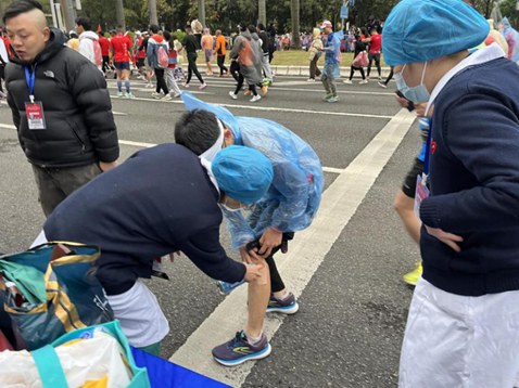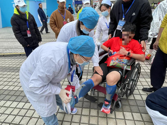 賽中,醫(yī)療保障隊第一時間發(fā)現(xiàn)身體不適選手,及時為患者檢查傷勢并進(jìn)行相應(yīng)醫(yī)療救治。