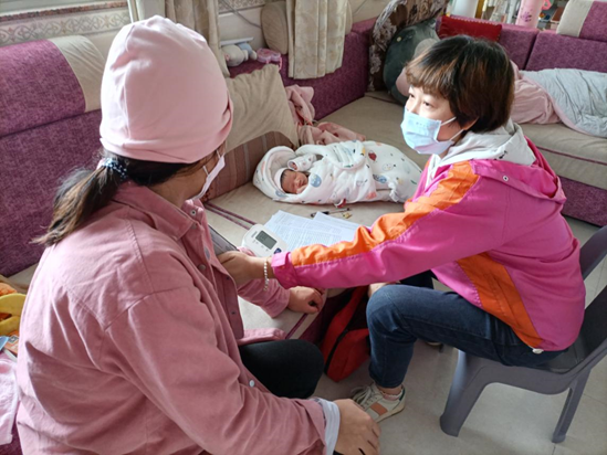 春節(jié)期間,她如約來到杜阮鎮(zhèn)杜臂村,訪視出院后一周內(nèi)的李女士,為新生兒進(jìn)行體測(cè)、肚臍消毒處理、臀部護(hù)理、喂養(yǎng)指導(dǎo)、沐浴指導(dǎo)、接種指導(dǎo)等,又為產(chǎn)婦進(jìn)行體測(cè)、乳汁分泌和宮縮情況檢查、切口消毒、產(chǎn)后膳食營養(yǎng)指導(dǎo)等。