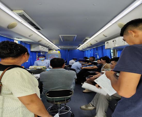 活動啟動后,附近不少居民踴躍加入無償獻(xiàn)血的行列。在流動獻(xiàn)血車前,大家有序排隊,填寫無償獻(xiàn)血登記表、血壓測量、錄入電腦、血液初篩、獻(xiàn)熱血。他們以捐獻(xiàn)熱血的方式,為生命助力、為愛禮贊。