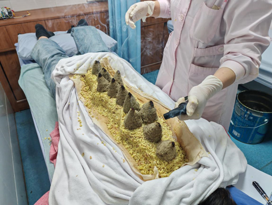 在荷塘鎮(zhèn)衛(wèi)生院中醫(yī)館里,幾張治療床全部客滿。其中,一半以上都是來做姜療的。容女士長時(shí)間待在空調(diào)房,肩膀頸椎倍感不適,慕名前來治療。俯臥在治療床上,容女士脊柱上鋪滿生姜,生姜上的艾絨緩緩燃燒,青煙裊裊升起,溫暖徐徐滲透。第一次嘗試姜療的容女士,對此贊不絕口。