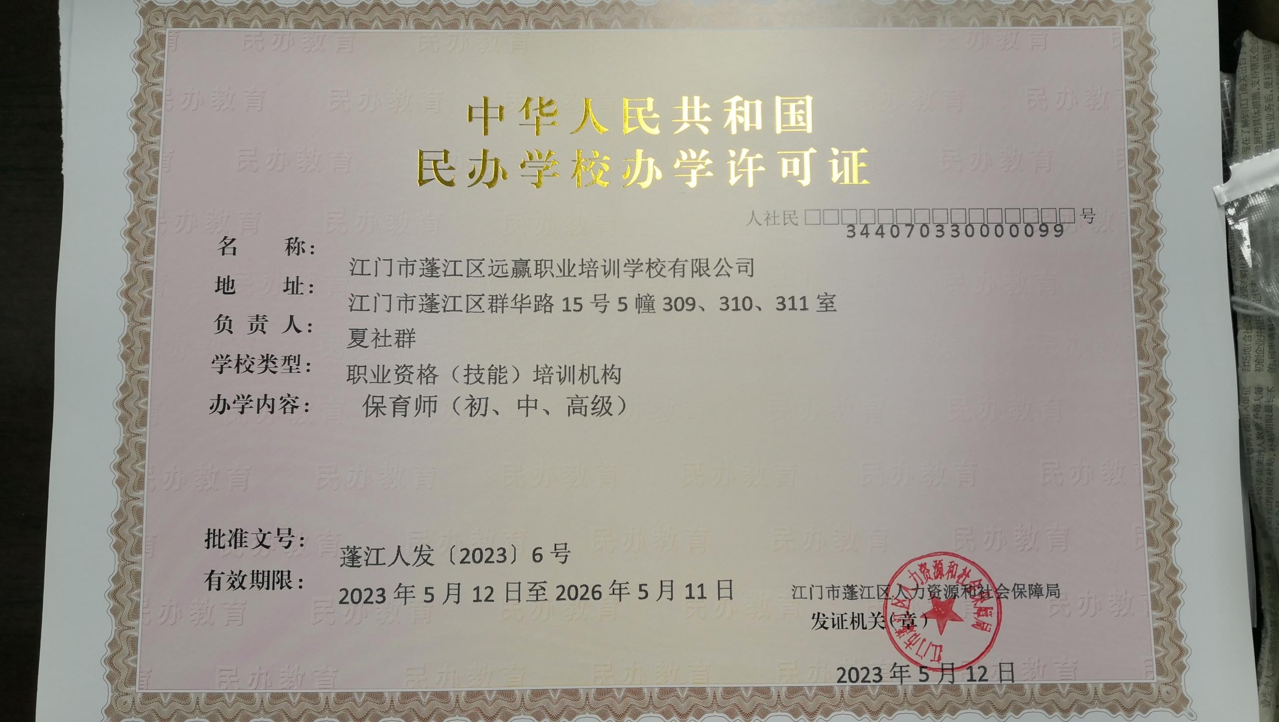 您報送的新設立江門市蓬江區(qū)遠贏職業(yè)培訓學校有限公司申請材料已收悉,現批復如下:根據民辦教育的有關規(guī)定,經審核,現同意江門市蓬江區(qū)遠贏職業(yè)培訓學校有限公司設立申請,并頒發(fā)辦學許可證。