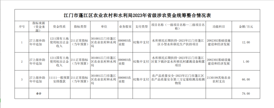 我局2023年省級(jí)涉農(nóng)資金統(tǒng)籌整合項(xiàng)目共3個(gè),合計(jì)79萬(wàn)元?,F(xiàn)將相關(guān)項(xiàng)目及資金情況予以公示: