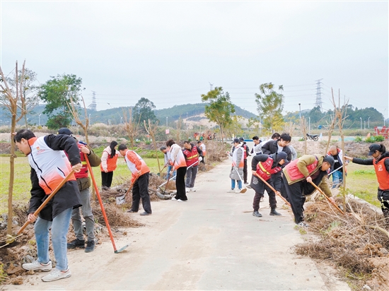 早春三月,萬物復(fù)蘇,植樹添綠正當(dāng)時(shí)。在棠下鎮(zhèn)五洞村,蓬江區(qū)農(nóng)業(yè)農(nóng)村和水利局機(jī)關(guān)黨支部與五洞村、中國一冶集團(tuán)聯(lián)動開展植樹綠化主題黨日活動,50多名黨員干部和村民三五一組,在全長1.2公里的村道旁“見縫插綠”,種下200多棵桂花樹。另一邊,來自中國一冶集團(tuán)團(tuán)支部的團(tuán)員也種植了數(shù)十棵黃花風(fēng)鈴木,一棵棵小樹苗錯(cuò)落有致地挺立在春風(fēng)里,為村道點(diǎn)綴新綠。這是蓬江區(qū)農(nóng)業(yè)農(nóng)村和水利局堅(jiān)持黨建引領(lǐng),整合各方資源,營造植綠護(hù)綠良好氛圍,引導(dǎo)黨員干部群眾積極參與綠美蓬江生態(tài)建設(shè)的亮麗縮影。