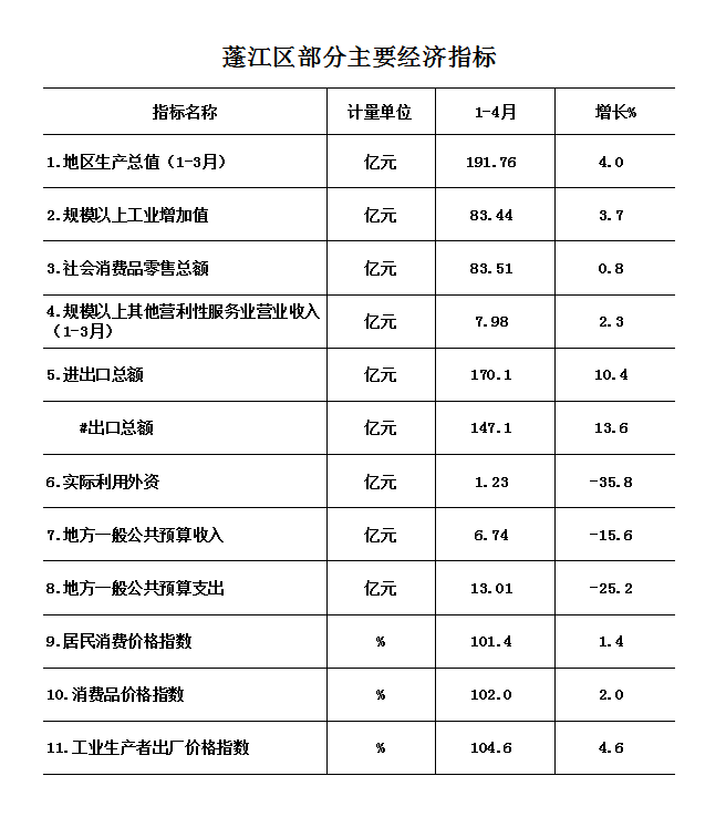 1-4月,蓬江區(qū)主要經(jīng)濟(jì)指標(biāo)增長總體平穩(wěn),但經(jīng)濟(jì)發(fā)展存在較多不確定因素。